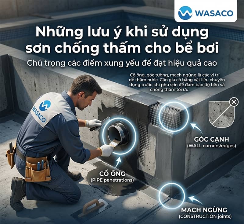Các vị trí như cổ ống, góc tường, mạch ngừng là những điểm dễ xảy ra thấm nước nhất. Cần gia cố bằng vật liệu chuyên dụng trước khi phủ sơn để tăng khả năng chống thấm. Theo Chống thấm Wasaco, nhiều trường hợp thấm nước xuất phát từ việc bỏ qua các chi tiết nhỏ này trong quá trình thi công.
