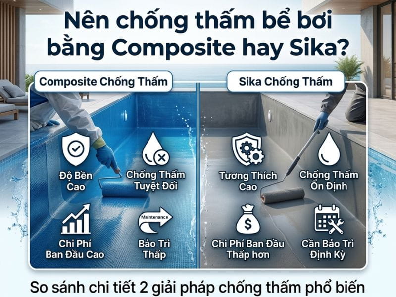 Để trả lời chính xác câu hỏi “Nên chống thấm bể bơi bằng composite hay sika”, cần đánh giá hai phương pháp này dựa trên nhiều tiêu chí quan trọng thay vì chỉ nhìn vào chi phí ban đầu. Trên thực tế, mỗi vật liệu sẽ phù hợp với từng điều kiện công trình khác nhau, và sự khác biệt sẽ thể hiện rõ qua độ bền, khả năng thích nghi và chi phí vận hành lâu dài. Dưới đây là phân tích chi tiết giúp bạn có cái nhìn toàn diện hơn trước khi đưa ra quyết định.